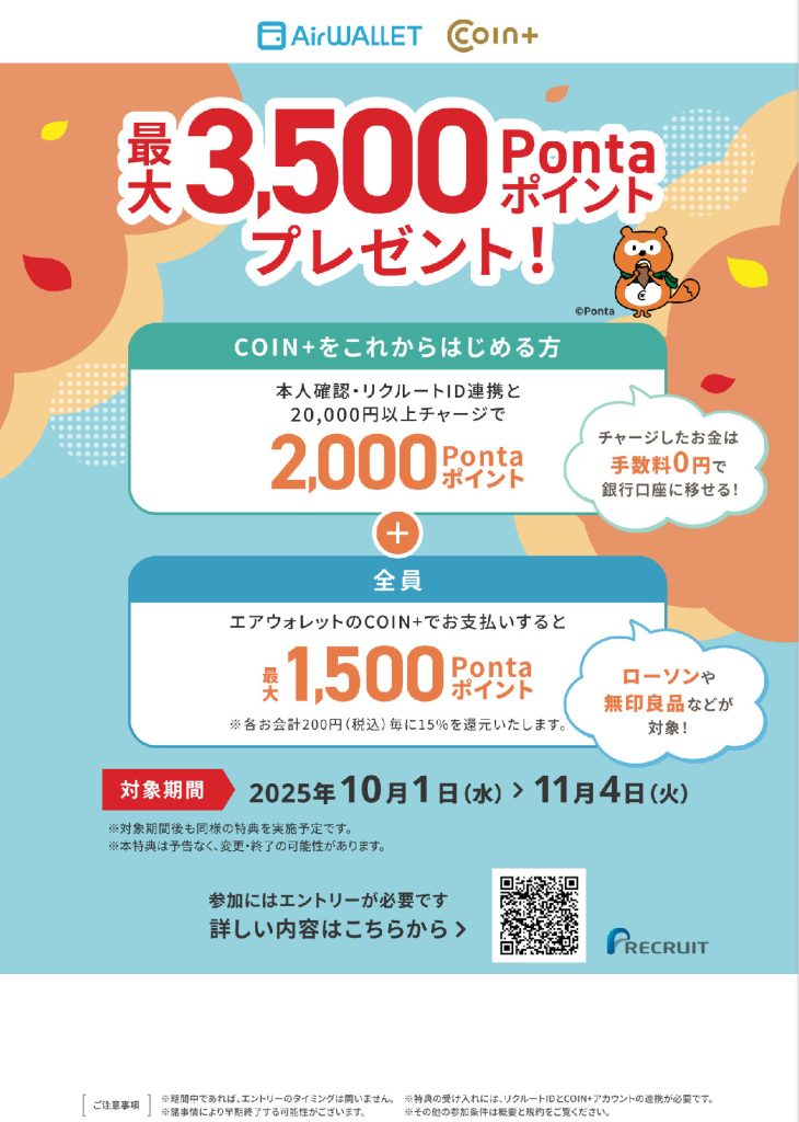 1.期間中、対象店舗にてエアウォレットでお支払いすると、お支払い金額の200円(税込)毎に15%のPontaポイントプレゼント(付与上限1,500ポイント)